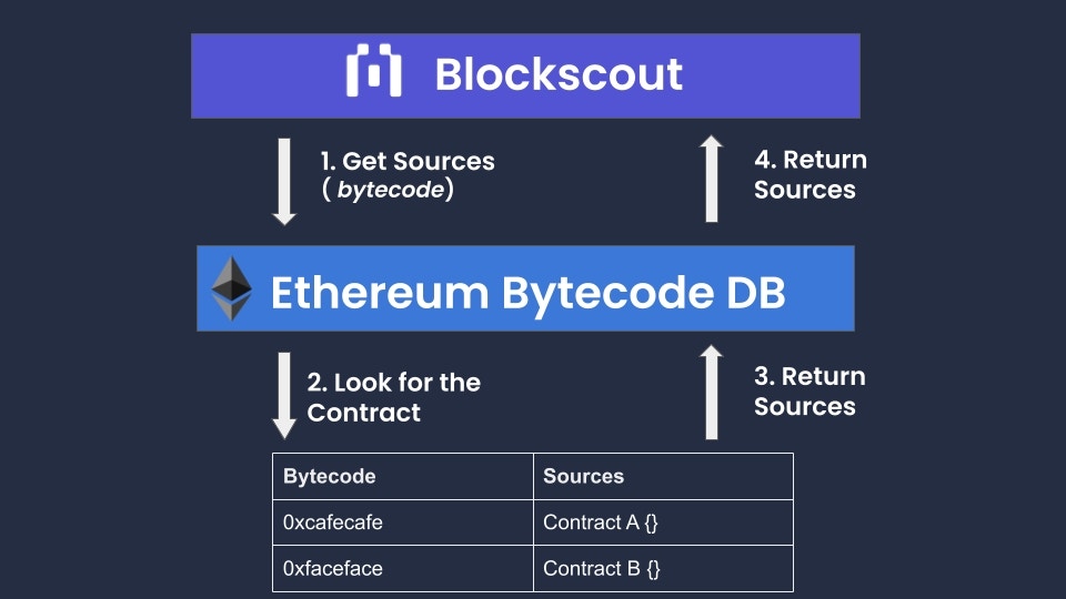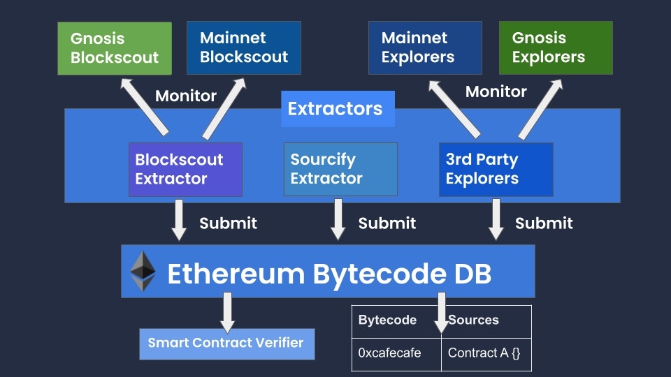 Implemented as a separate service, Ethereum Bytecode Database may become a unique source of verified contracts working with many chains. Furthermore, the addition of extractors allows verified contracts to be combined from an unlimited number of explorers, and gives users the ability to run the service locally using independently-obtained data. Extractors implemented within a Blockscout private setting also allow for the creation of a unique and useful ecosystem-wide database. This will likely create a data source that will be attractive to different explorers and other data aggregators. We are currently looking into the best way to provide 3rd party access to this dataset, possibly as a paid database or verifier service in the future.Implementation Details