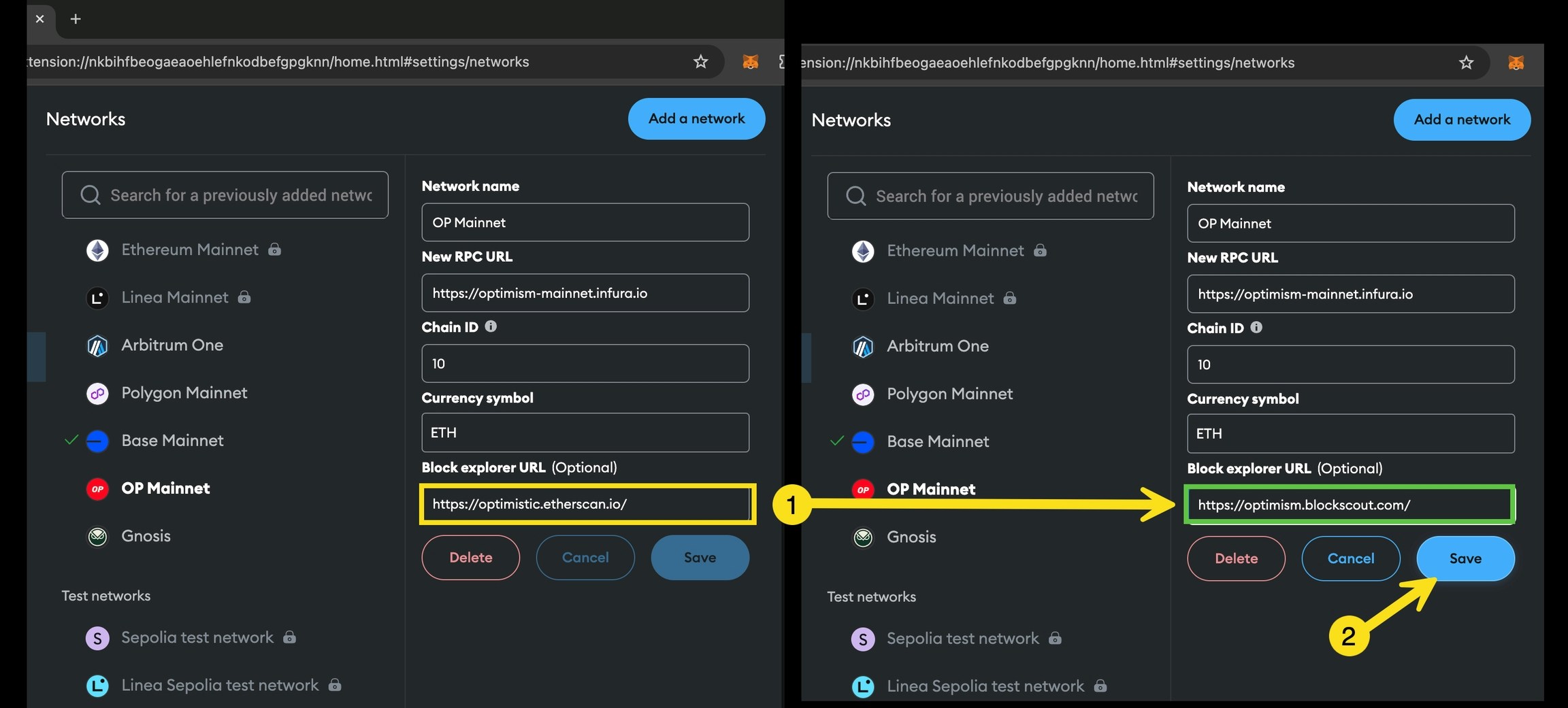 - Change the url to blockscout (ie https://optimism.blockscout.com/) and Save.