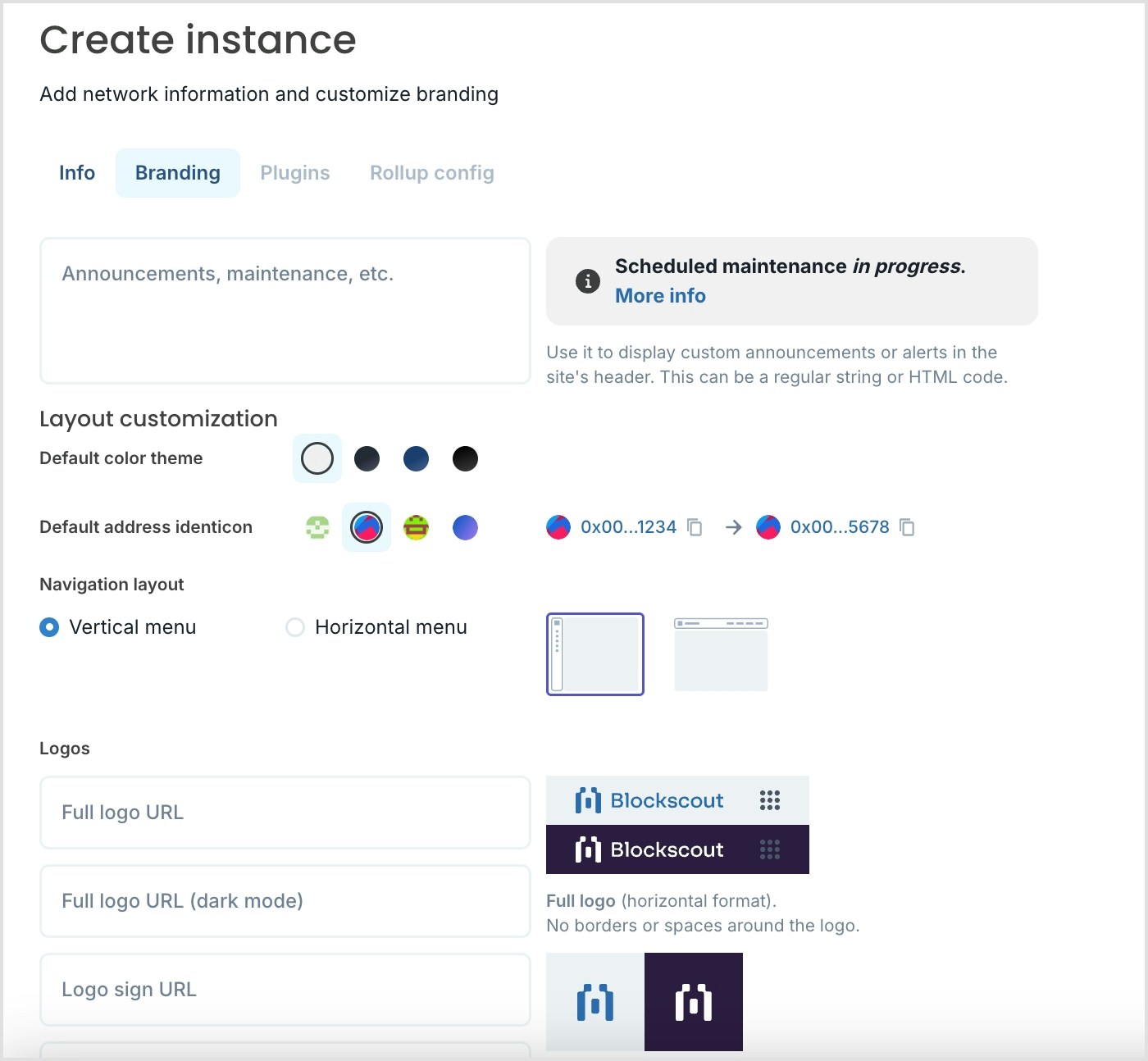 - Default address identicon: Select from 4 different options for default identicons in your instance.