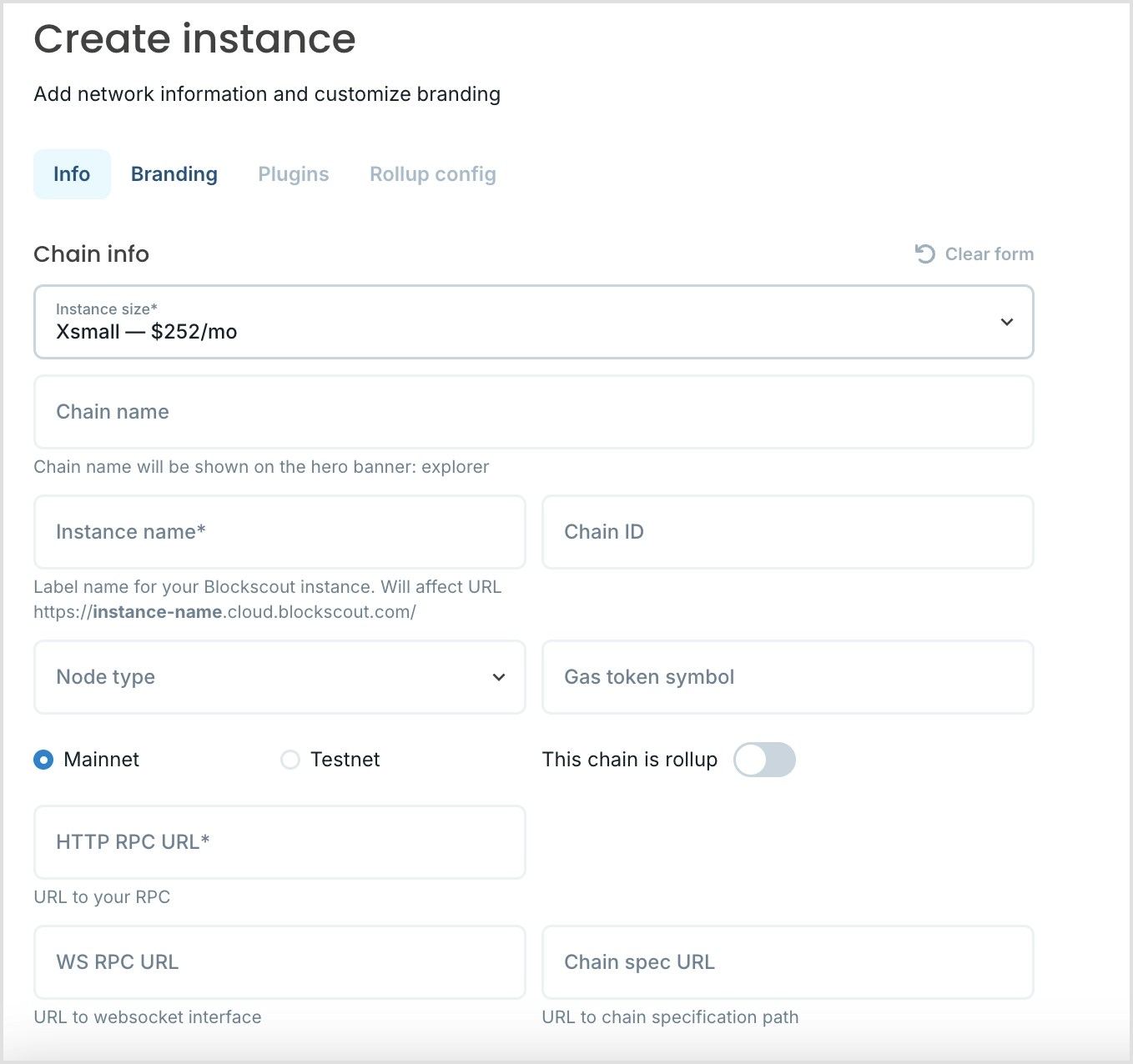 - Instance name*: A label for your instance, it is reflected in the url of the instance ie https://instance-name.cloud.blockscout.com/
