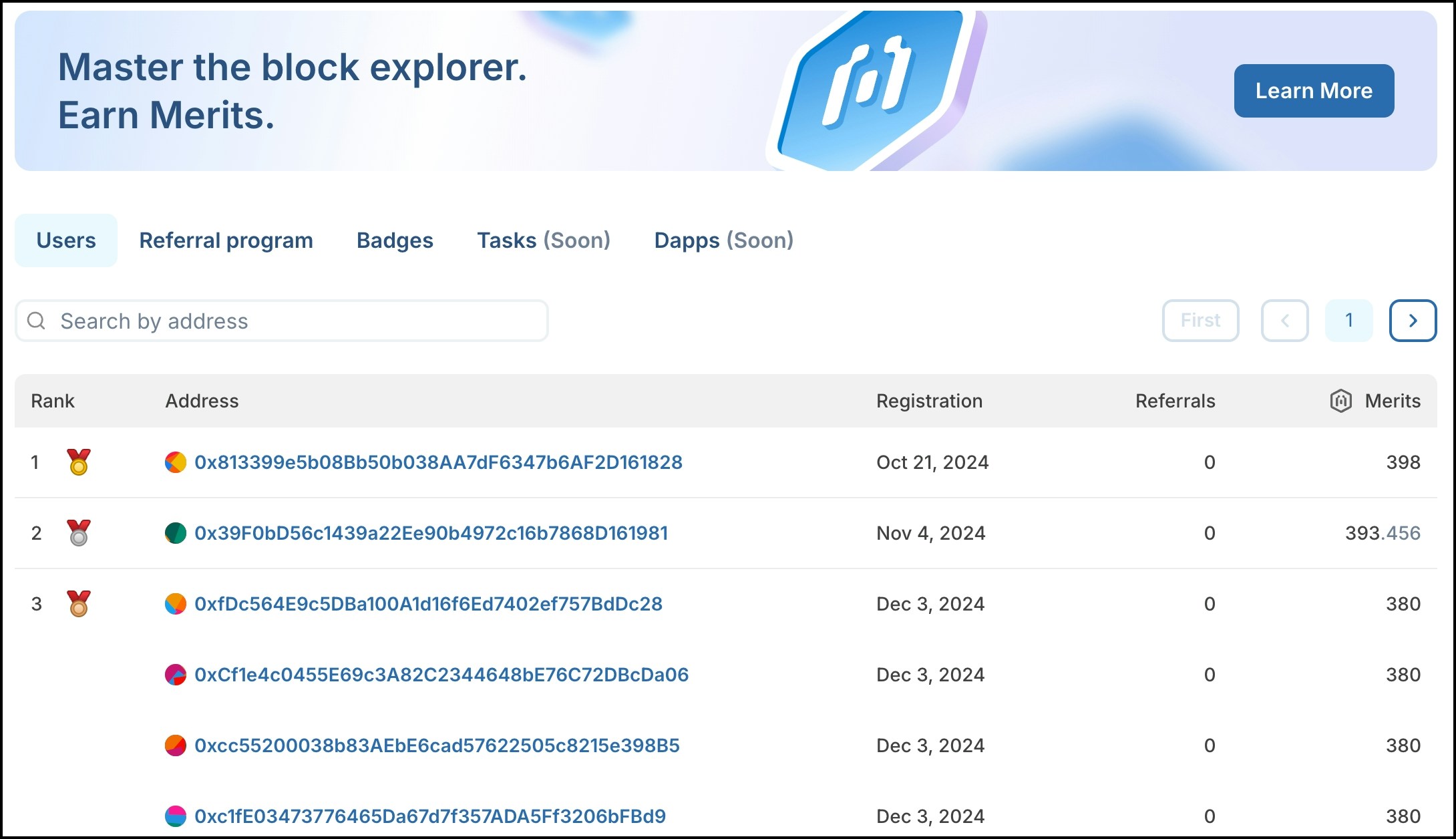 - Ranking is determined by the number of Merits earned. If addresses share the same number of Merits, they all share the same rank. In this example, all accounts have 352 Merits, and are all ranked 12.