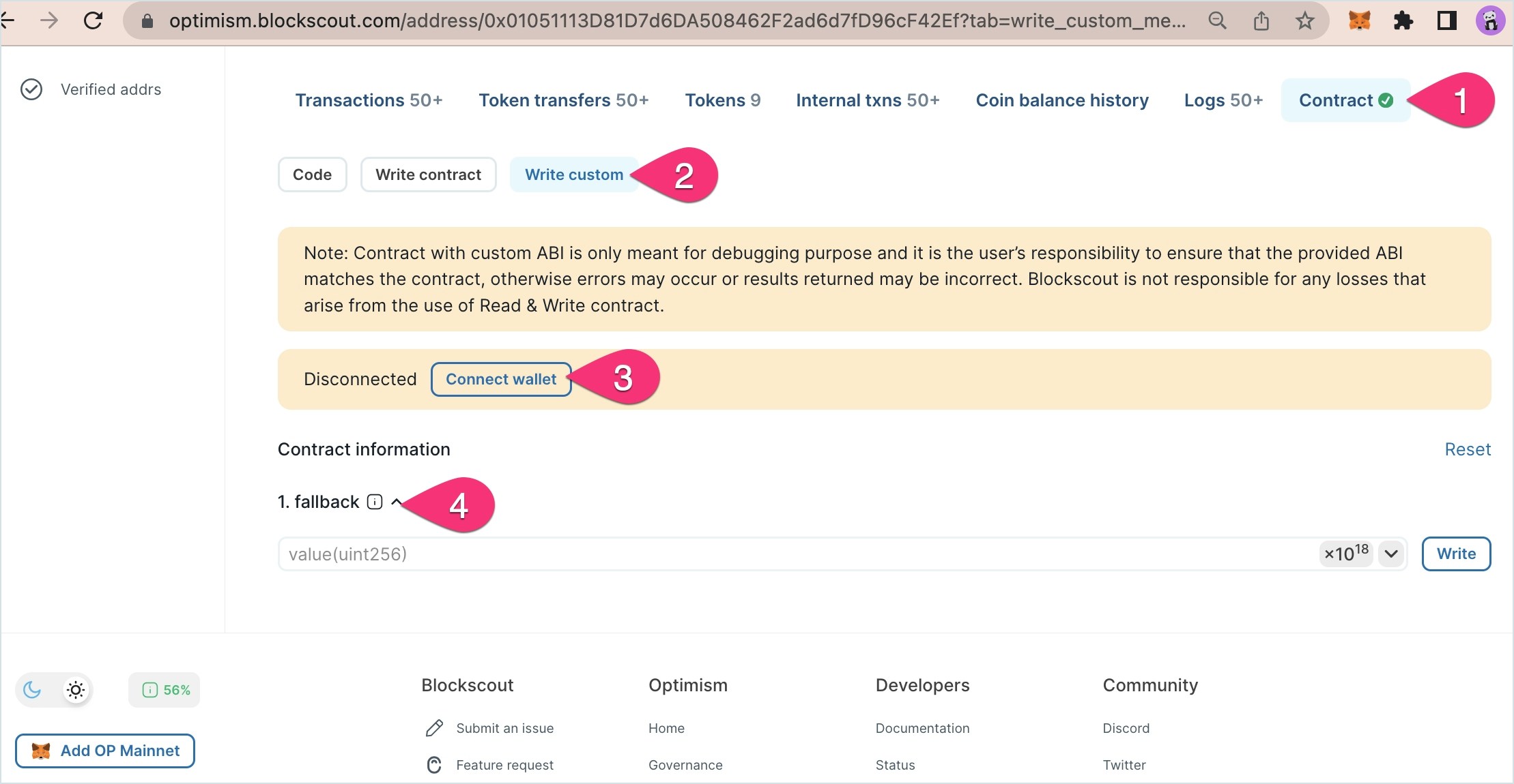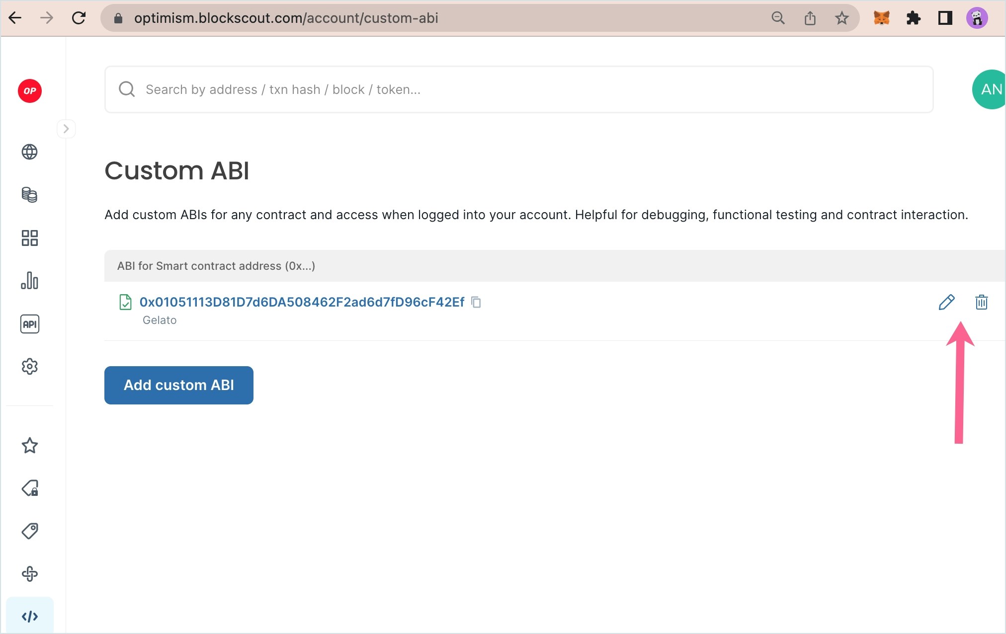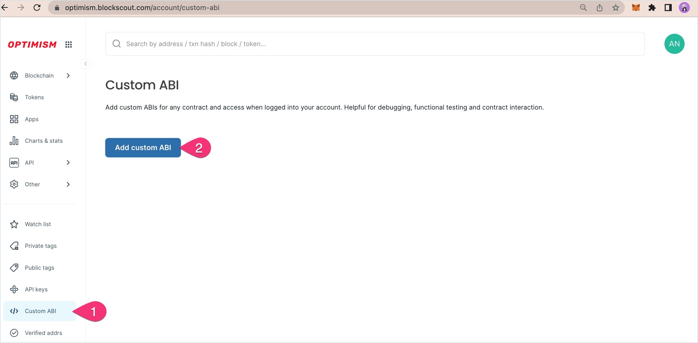 You will need to be logged into My Account to interact with your custom ABIs. Once you added, you can visit the contract to interact with the custom ABI.- Go to the contract page.