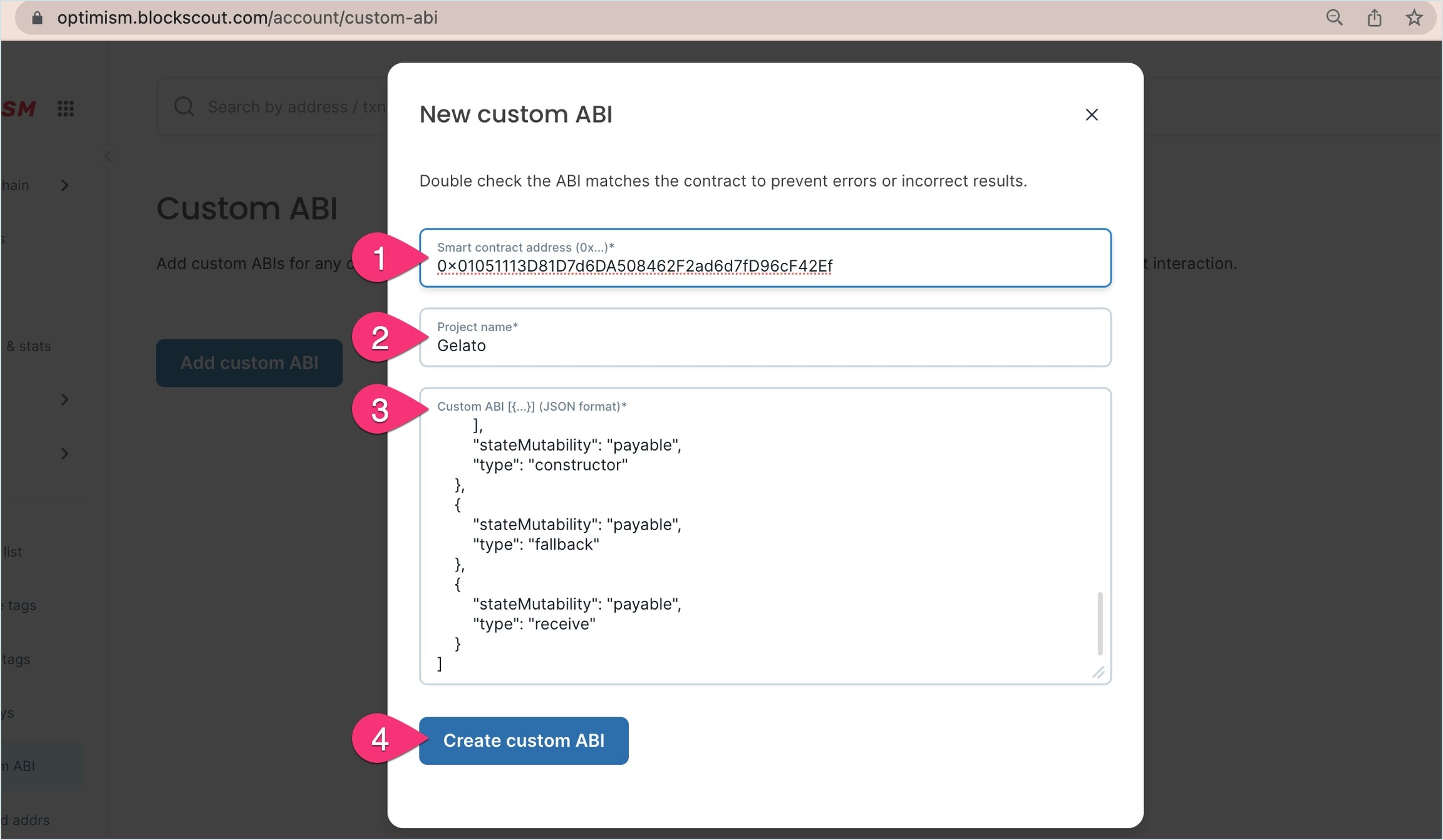 - Custom ABI: Copy and paste in the ABI for the contract from your development environment (truffle, hardhat, remix etc) or if the contract is verified you can copy from Blockscout.