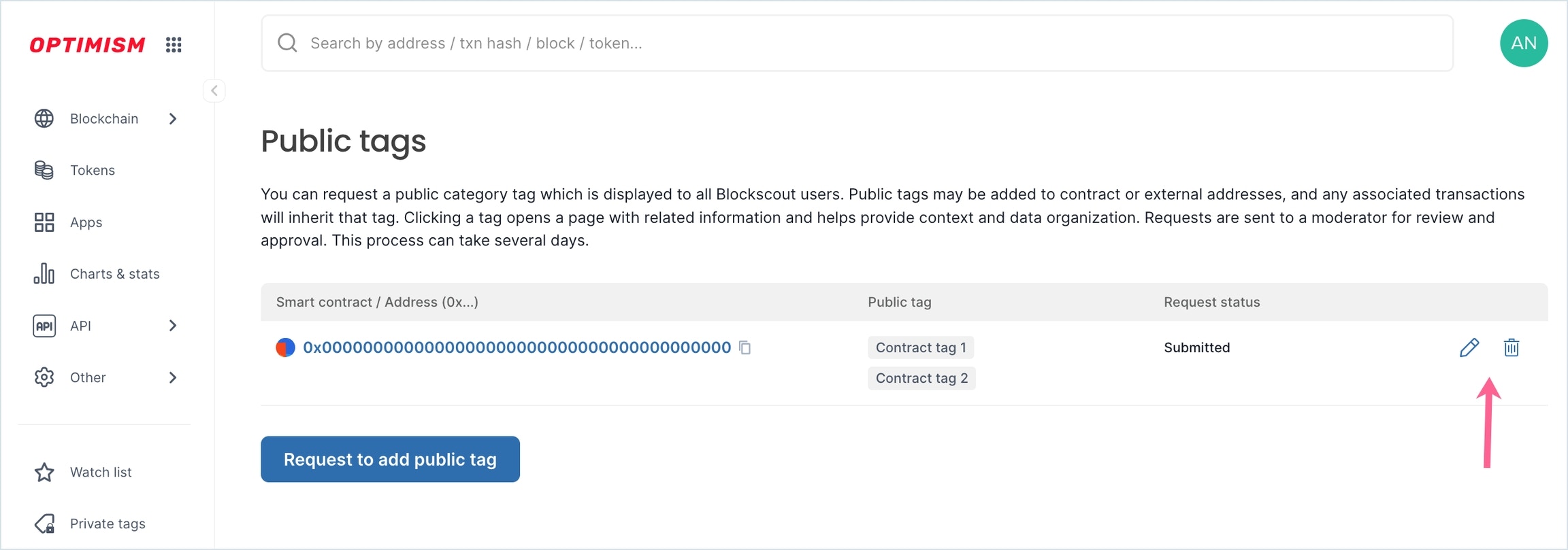 Use the icons to edit or delete your public tag request